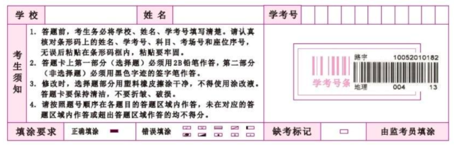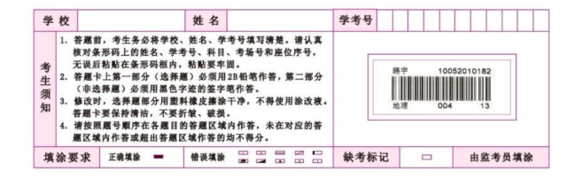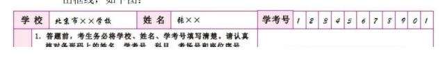 3.答題前要仔細閱讀答題卡上的“考生須知”。務(wù)必用黑色字跡的簽字筆將答題卡左上角的學校名稱、姓名、學考號填寫清楚,字跡不能超出框線,如下圖: