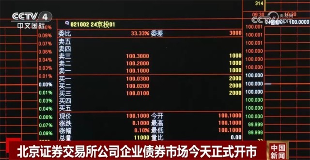 央視網(wǎng)消息:1月15日上午,北京證券交易所公司企業(yè)債券市場(chǎng)正式開市。開市首日,北交所公司企業(yè)債券市場(chǎng)上市3只企業(yè)債券,債券發(fā)行規(guī)模合計(jì)24.8億元。