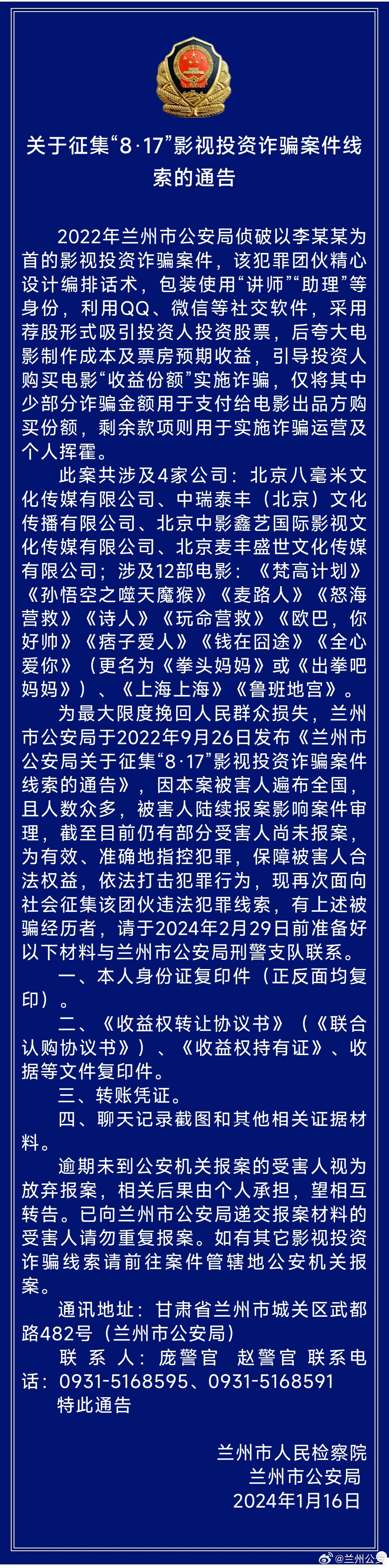 1月16日,蘭州市人民檢察院、蘭州市公安局聯(lián)合發(fā)布通告稱,2022年,蘭州市公安局偵破以李某某為首的影視投資詐騙案件,該犯罪團(tuán)伙精心設(shè)計編排話術(shù),包裝使用“講師”“助理”等身份,利用QQ、微信等社交軟件,采用薦股形式吸引投資人投資股票,后夸大電影制作成本及票房預(yù)期收益,引導(dǎo)投資人購買電影“收益份額”實施詐騙,僅將其中少部分詐騙金額用于支付給電影出品方購買份額,剩余款項則用于實施詐騙運營及個人揮霍。