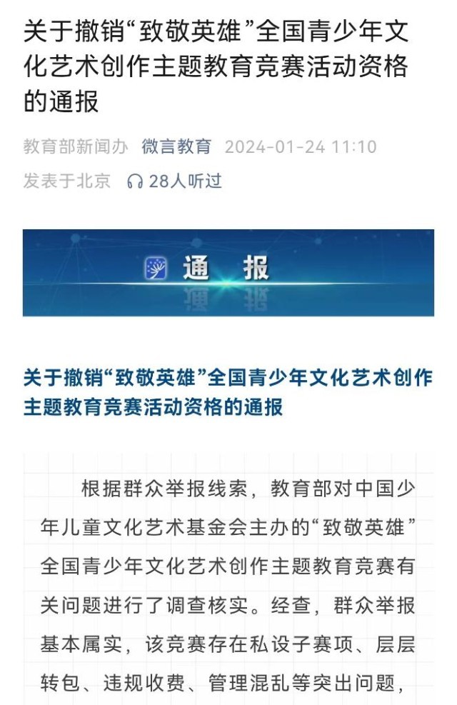 教育部1月24日通報(bào),根據(jù)群眾舉報(bào)線索,教育部對中國少年兒童文化藝術(shù)基金會(huì)主辦的“致敬英雄”全國青少年文化藝術(shù)創(chuàng)作主題教育競賽有關(guān)問題進(jìn)行了調(diào)查核實(shí)。經(jīng)查,群眾舉報(bào)基本屬實(shí),該競賽存在私設(shè)子賽項(xiàng)、層層轉(zhuǎn)包、違規(guī)收費(fèi)、管理混亂等突出問題,在社會(huì)上造成了惡劣影響。