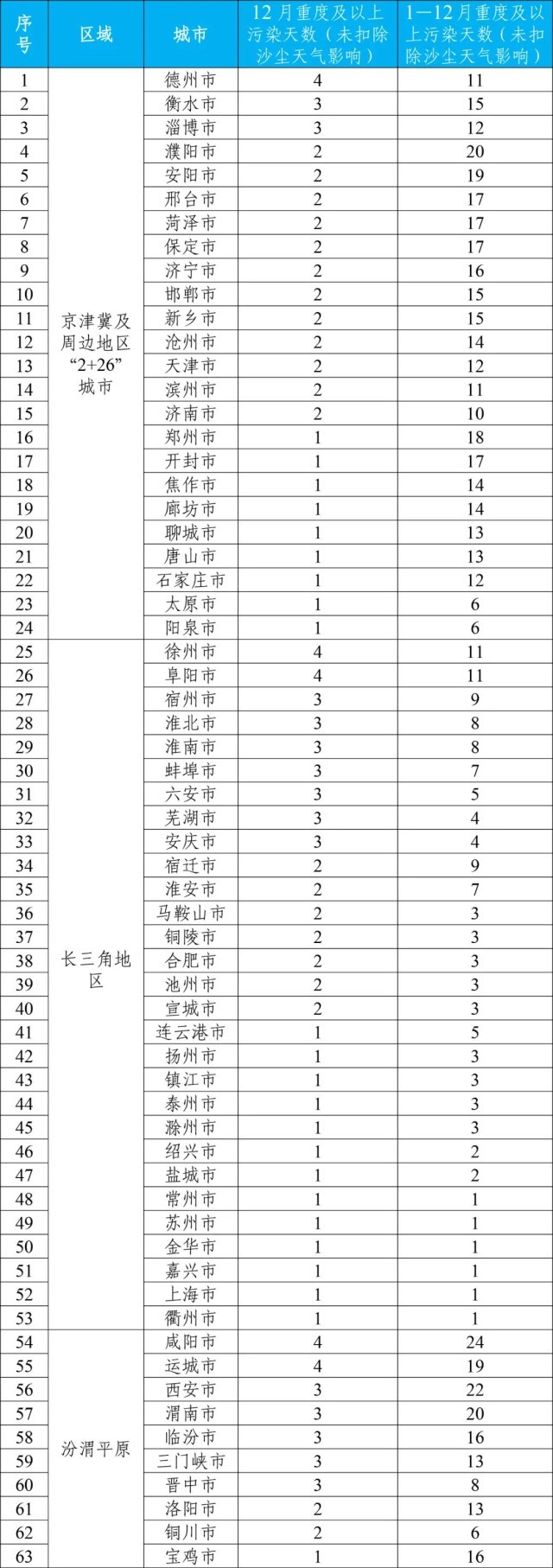 12月和1—12月重點區(qū)域出現(xiàn)重度及以上污染天的城市及具體天數(shù)詳見附表4。