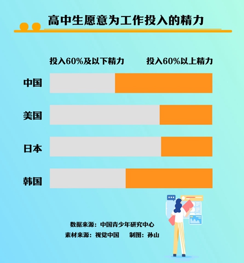 對(duì)于未來的工作,受訪高中生愿意投入多少精力?調(diào)查發(fā)現(xiàn),假設(shè)全部精力是100%,愿意為工作投入80%以上精力的中國高中生占比16.2%,愿意投入60%到80%精力的高中生占比43.8%,合計(jì)有六成受訪中國高中生愿意為工作投入60%以上精力,在四國受訪高中生中最高,其次是韓國高中生(53.3%),美國和日本高中生愿意投入60%以上精力的比例均只有三成多(32.4%和31.6%)。可見,中國和韓國高中生更愿意投入較多精力在工作上。