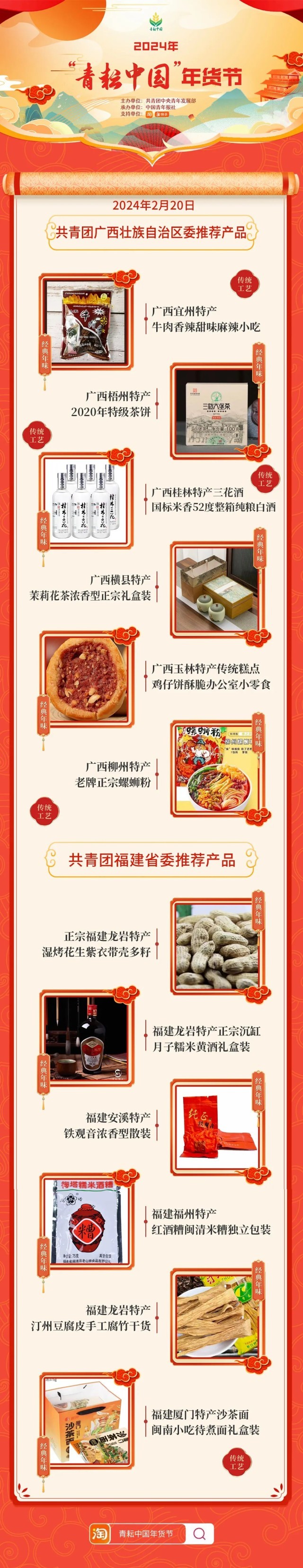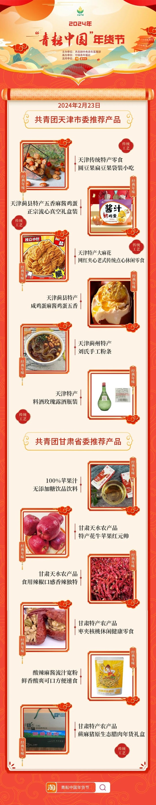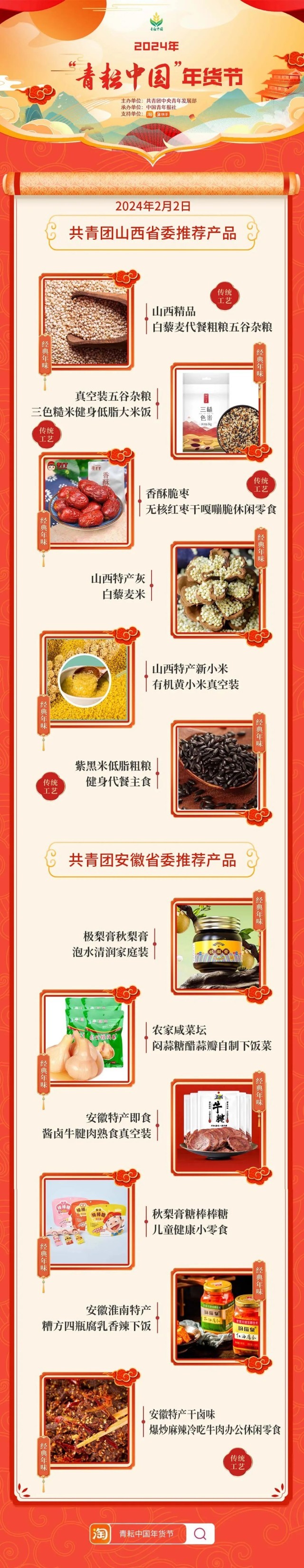 2024年“青耘中國”年貨節(jié)將于1月31日至2月24日,開展“一日兩省”主題日活動。用戶可在淘寶APP搜索“青耘中國年貨節(jié)”進入專題頁選購產(chǎn)品。
