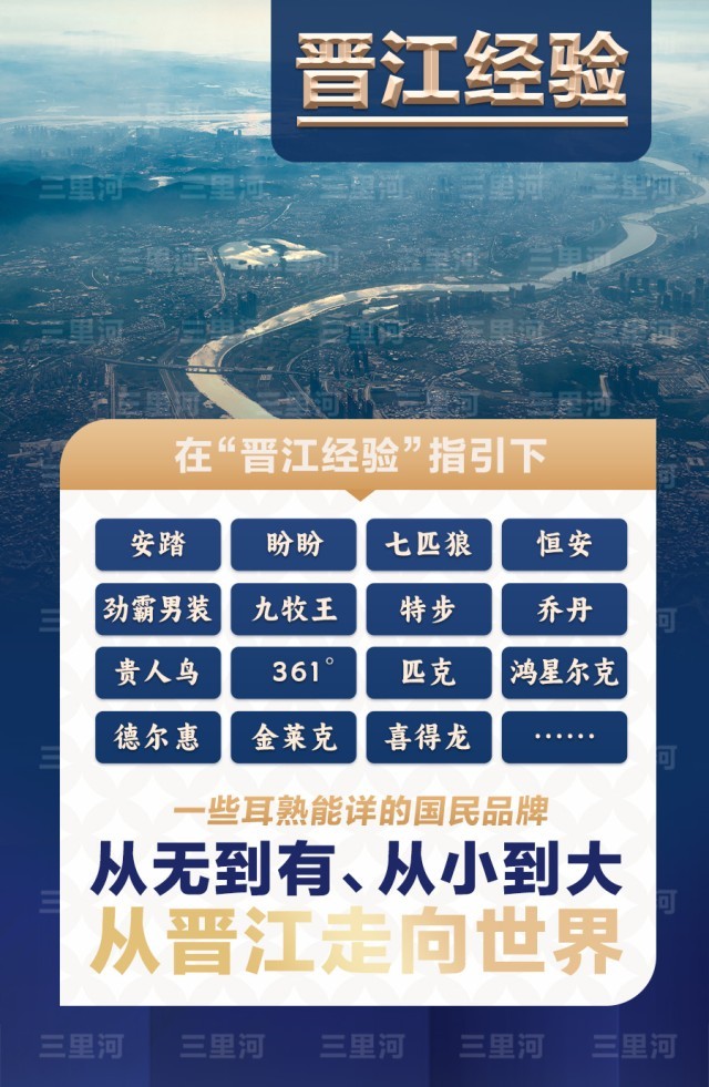 你可能不知道晉江是個僅有700多平方公里的縣城,但你一定聽說過,安踏、盼盼、七匹狼、恒安、勁霸男裝、鴻星爾克、九牧王、特步、喬丹、貴人鳥、361°、德爾惠、金萊克、喜得龍……