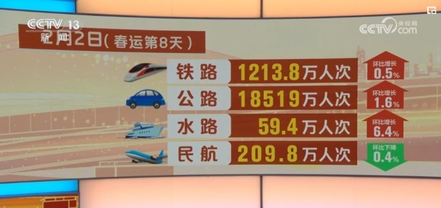 2024年綜合運(yùn)輸春運(yùn)工作專班數(shù)據(jù)顯示,春運(yùn)前8天,超15.5億人次出行。2月2日,也就是春運(yùn)第八天,全社會(huì)跨區(qū)域人員流動(dòng)量超2億人次,為2024年春運(yùn)以來(lái)跨區(qū)域人員流動(dòng)最多的一天。