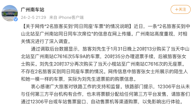 2名旅客買到“同日同車次席位”?廣州南站回應(yīng)