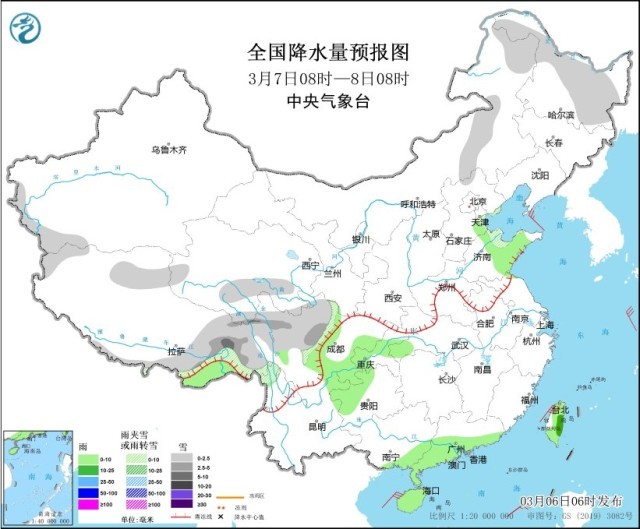 3月6日08時(shí)至7日08時(shí),西藏東部和南部、青海南部、川西高原北部、山西北部等地部分地區(qū)有小雪或雨夾雪,其中,西藏東部、川西高原北部等地部分地區(qū)有中到大雪。江南東部和南部、西南地區(qū)東部、華南中東部、臺(tái)灣島等地部分地區(qū)有小雨,其中,臺(tái)灣島北部等地部分地區(qū)有中雨。內(nèi)蒙古西北部部分地區(qū)有4~5級(jí)風(fēng)(見圖1)。