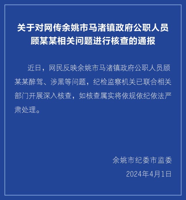 鎮(zhèn)政府公職人員醉駕、涉黑?浙江余姚市紀(jì)委市監(jiān)委:開展深入核查
