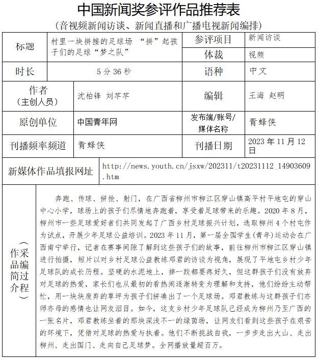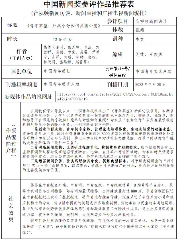 中國(guó)青年報(bào)社推薦參評(píng)第34屆中國(guó)新聞獎(jiǎng)音視頻新聞訪談、音視頻新聞直播等作品專(zhuān)項(xiàng)初評(píng)公示