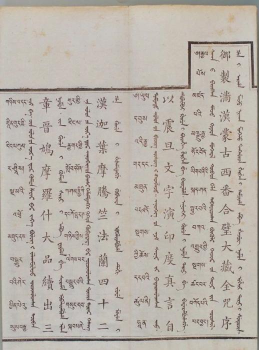 康熙皇帝特別注重刊行蒙古文《甘珠爾》以“利于祭誦”,康熙五十六年(1717年)下令刊刻蒙古文《甘珠爾》。到了乾隆三十二年(1767年),傅恒上書提出,要讓僧人念經(jīng)念得準,需要標明原音、輔音的韻腳和切音,最好能看著漢字就能念出梵音(“禮今教習僧人持念咒語止,須明曉阿禮嘎禮音韻反切,自能對漢字而得梵音”)。于是,為方便蒙古地區(qū)僧人念誦咒語,《御制滿漢西番合璧大藏全咒》添譯了蒙古文。蒙古文《大藏經(jīng)》是蒙古族歷史文化發(fā)展的里程碑,也是蒙古族已知最大部頭的古籍。在譯經(jīng)過程中,蒙古文字也得到了充分錘煉與發(fā)展,提高了交流與表現(xiàn)能力。