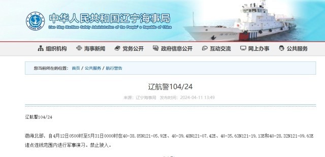 遼寧海事局發(fā)布航行警告,4月12日5時(shí)至5月31日0時(shí),渤海部分海域?qū)⑦M(jìn)行軍事演習(xí)。禁止駛?cè)搿?/p>