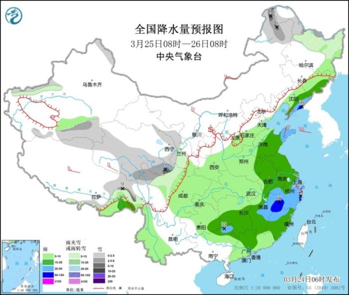 3月25日08時(shí)至26日08時(shí),內(nèi)蒙古東北部、黑龍江北部、新疆南疆盆地、西藏北部、青海中南部、甘肅西南部、川西高原北部等地的部分地區(qū)有小到中雪或雨夾雪,其中,內(nèi)蒙古東北部、黑龍江西北部、西藏東部等地的部分地區(qū)有大雪(5~9毫米)。吉林東南部、遼寧東部、山東中東部、江淮、江南大部、貴州東南部、華南北部等地的部分地區(qū)有中到大雨,其中,遼寧東部、江西北部、浙江西南部、福建西北部等地的部分地區(qū)暴雨(50~80毫米)。內(nèi)蒙古中西部、遼東半島、西藏北部、青海南部、陜西北部、山東半島、浙江北部等地的部分地區(qū)有4~6級(jí)風(fēng)(見圖3)。