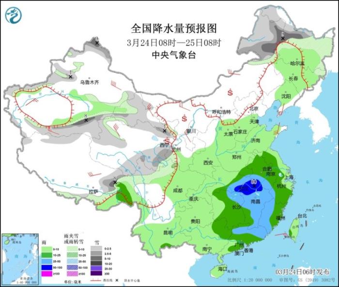 3月24日08時(shí)至25日08時(shí),內(nèi)蒙古東部、黑龍江北部和東部、新疆西北部和南部、西藏東北部、青海北部和東南部、甘肅河西和西南部等地的部分地區(qū)有小到中雪或雨夾雪,其中,內(nèi)蒙古東北部、黑龍江西部、新疆北疆北部和南疆盆地等地的部分地區(qū)有大雪(5~9毫米)。江淮大部、江漢東部、江南大部、華南中東部等地的部分地區(qū)有中到大雨,其中,安徽西南部、湖北東部、江西北部等地的部分地區(qū)暴雨(50~80毫米)。內(nèi)蒙古中西部、遼東半島、新疆南部、西藏北部、甘肅河西、寧夏中北部、山東半島等地的部分地區(qū)有4~6級風(fēng),其中,新疆東部、青海西北部等地的部分地區(qū)有6~7級風(fēng)(見圖2)。