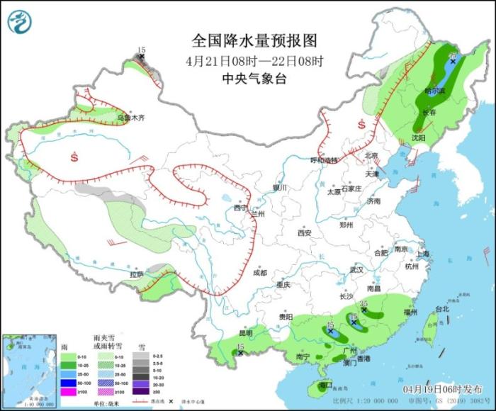 4月21日08時至22日08時,新疆北疆北部和沿天山地區(qū)、西藏北部和東部、青海西南部、內蒙古東部等地的部分地區(qū)有小到中雪或雨夾雪,其中阿勒泰高海拔地區(qū)局地有大雪或暴雪(10~15毫米);黑龍江中部、吉林中部、遼寧北部、江西南部、湖南南部、廣東北部、廣西東部、海南島、云南南部等地的部分地區(qū)中到大雨。內蒙古中西部、東北地區(qū)、華北中北部、山東半島、西藏中北部等地的部分地區(qū)有4~6級風(見圖3);黃海北部海域有6~7級、陣風8級的偏南風,渤海、渤海海峽、黃海中部和南部海域有5~6級、陣風7級的偏南到西北風。