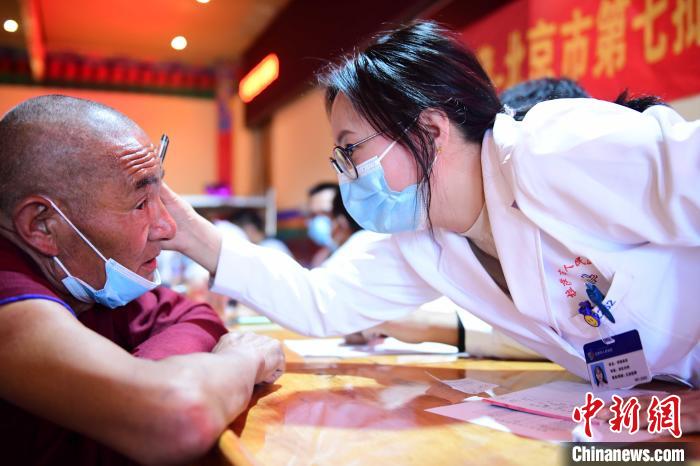 圖為醫(yī)護人員耐心為哲蚌寺僧眾看診?!∝暩聛硭?攝