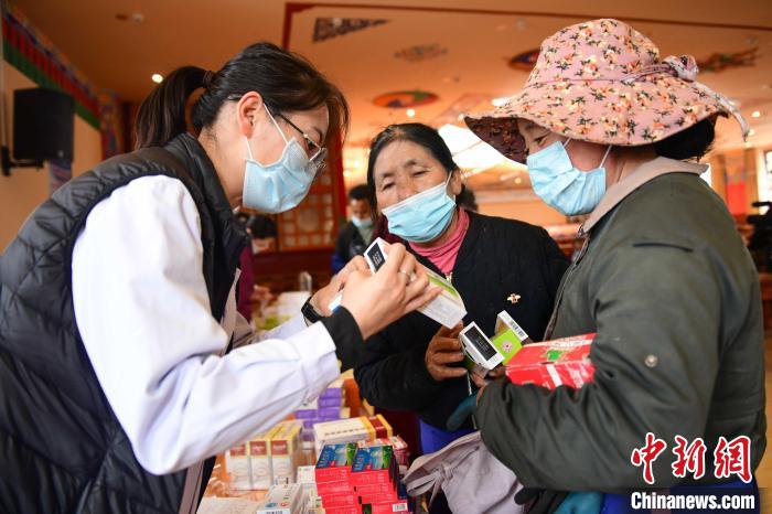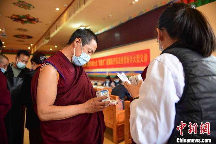 圖為醫(yī)護人員為哲蚌寺僧眾發(fā)放藥品。 貢嘎來松 攝