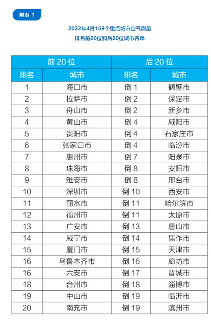 在重點城市排名中,4月,168個重點城市中,???、拉薩和舟山市等20個城市空氣質(zhì)量相對較好;鶴壁、保定和新鄉(xiāng)市等20個城市空氣質(zhì)量相對較差。