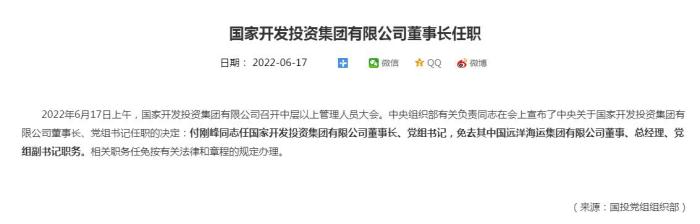 中新財經(jīng)6月17日電 國家開發(fā)投資集團(tuán)有限公司網(wǎng)站6月17日消息,2022年6月17日上午,國家開發(fā)投資集團(tuán)有限公司召開中層以上管理人員大會。中央組織部有關(guān)負(fù)責(zé)同志在會上宣布了中央關(guān)于國家開發(fā)投資集團(tuán)有限公司董事長、黨組書記任職的決定:付剛峰同志任國家開發(fā)投資集團(tuán)有限公司董事長、黨組書記,免去其中國遠(yuǎn)洋海運集團(tuán)有限公司董事、總經(jīng)理、黨組副書記職務(wù)。相關(guān)職務(wù)任免按有關(guān)法律和章程的規(guī)定辦理。(完)