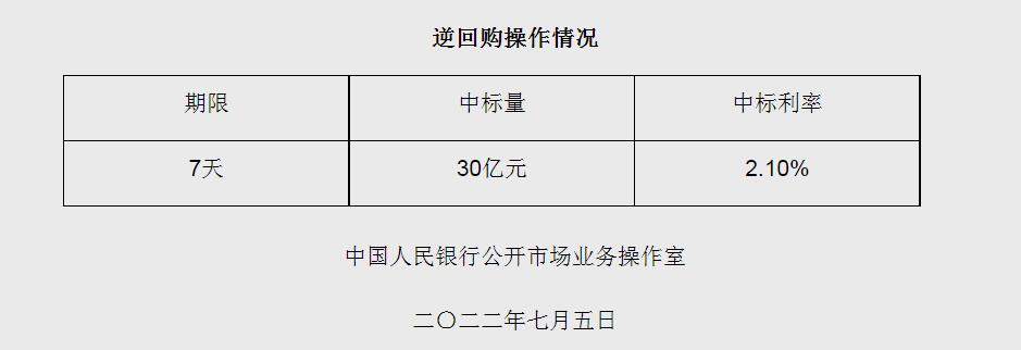 央行7月5日開(kāi)展30億元逆回購(gòu)操作 中標(biāo)利率2.10%