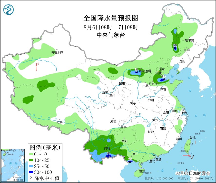 8月6日08時至7日08時,陜西北部、內(nèi)蒙古河套地區(qū)和東北部、吉林西部、黑龍江西南部、北京東部、河北中部、天津南部、山東北部、廣西西南部、云南大部等地部分地區(qū)有中到大雨,其中,內(nèi)蒙古東南部、河北東部、山東北部、廣西西南部、云南南部等地局部地區(qū)有暴雨(50~80毫米)。新疆南疆盆地部分地區(qū)有5~6級風(fēng)。
