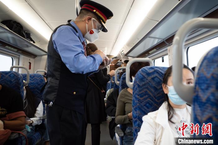 “請(qǐng)保管好自身財(cái)物,看管好小孩,照顧好老人,上下車注意腳下安全?!睌?shù)百名乘客陸續(xù)上車后,鐘靜開始在車廂里巡視。疫情防控期間,他要提醒大家戴好口罩。遇到行李架上行李擺放不規(guī)范,他要?jiǎng)邮终?。同時(shí),他還負(fù)責(zé)整列4節(jié)車廂的查票、補(bǔ)票工作。
