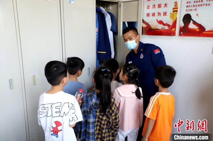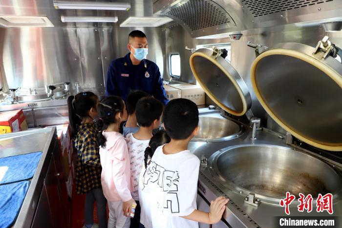 消防員帶領小朋友們參觀炊事車?!〔淘鲂?攝