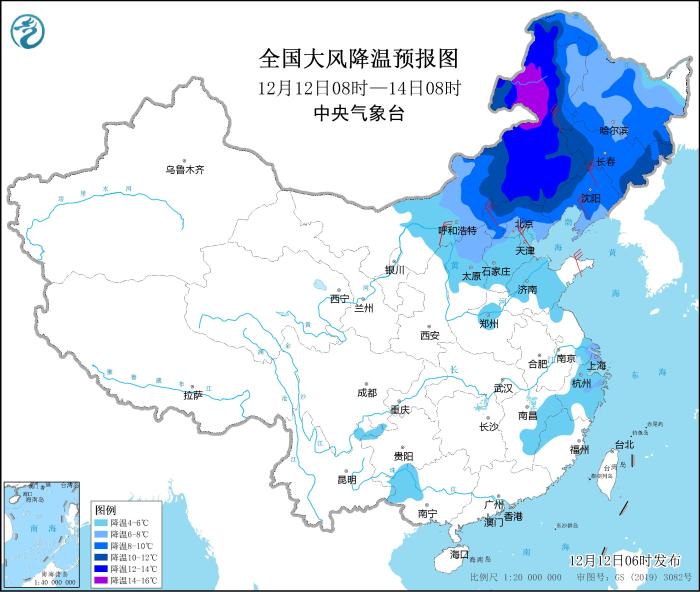 其中,12月12日08時至14日08時,內蒙古中東部、東北地區(qū)大部、華北中北部、山東中部、河南北部、江南中東部等地氣溫將下降4~8℃,其中,內蒙古東部、河北北部、遼寧西部、吉林西部等地部分地區(qū)降溫幅度可達10℃以上;上述部分地區(qū)并有4~6級偏北風,陣風7~8級。中央氣象臺12月12日06時繼續(xù)發(fā)布大風降溫預報。