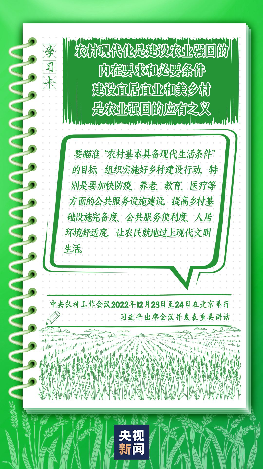 中央農(nóng)村工作會議12月23日至24日在北京舉行。習(xí)近平總書記出席會議并發(fā)表重要講話強調(diào),錨定建設(shè)農(nóng)業(yè)強國目標(biāo),切實抓好農(nóng)業(yè)農(nóng)村工作。如何建設(shè)農(nóng)業(yè)強國?總書記給出了“路線圖”,一起學(xué)習(xí)↓