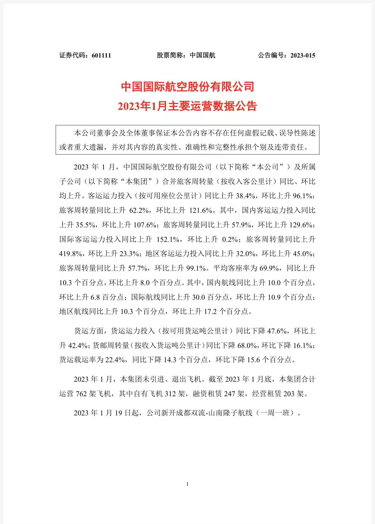 公告顯示,2023年1月,中國(guó)國(guó)航及所屬子公司合并旅客周轉(zhuǎn)量(按收入客公里計(jì))同比、環(huán)比均上升??瓦\(yùn)運(yùn)力投入(按可用座位公里計(jì))同比上升38.4%,環(huán)比上升96.1%;旅客周轉(zhuǎn)量同比上升62.2%,環(huán)比上升121.6%。