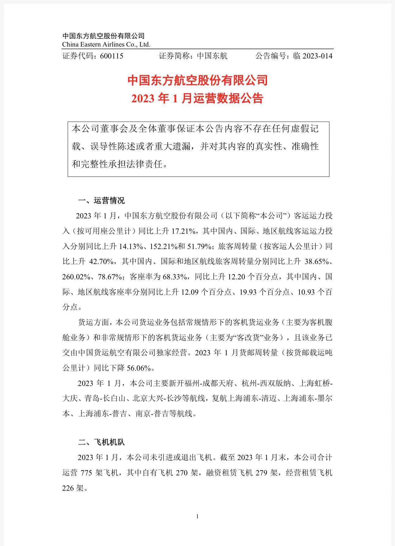 2023年1月,中國(guó)東航客運(yùn)運(yùn)力投入(按可用座公里計(jì))同比上升17.21%,旅客周轉(zhuǎn)量(按客運(yùn)人公里計(jì))同比上升42.70%。