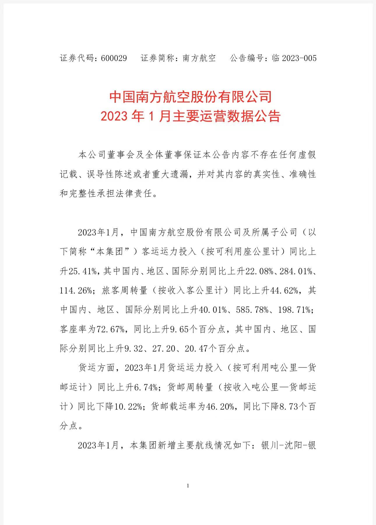 2023年1月,南方航空及所屬子公司客運(yùn)運(yùn)力投入(按可利用座公里計(jì))同比上升25.41%,旅客周轉(zhuǎn)量(按收入客公里計(jì))同比上升44.62%。(中新財(cái)經(jīng))