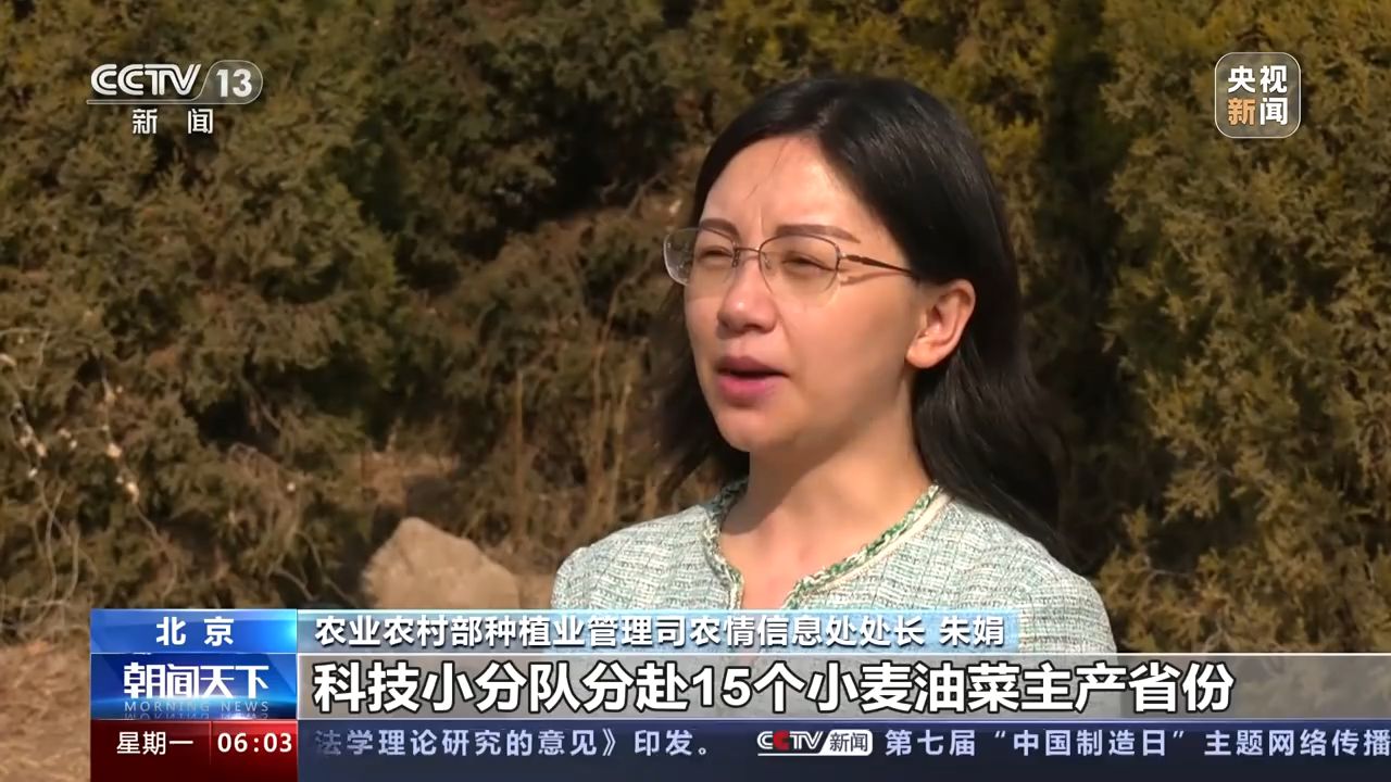 農(nóng)業(yè)農(nóng)村部種植業(yè)管理司農(nóng)情信息處處長 朱娟:科技小分隊分赴15個小麥油菜主產(chǎn)省份,包片蹲點,指導落實以“控旺促弱、抗旱防凍、防病治蟲”為重點的春季田管關(guān)鍵措施,全力以赴打贏夏糧豐收第一仗。(央視新聞客戶端)