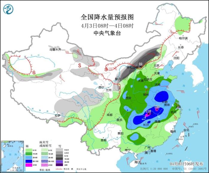 4月3日08時(shí)至4日08時(shí),新疆南疆盆地和東部、西藏東部、西北地區(qū)中部和東北部、內(nèi)蒙古中部、川西高原北部、陜西北部、山西北部、河北北部等地部分地區(qū)有小到中雪或雨夾雪,其中,內(nèi)蒙古中部、河北西北部等地部分地區(qū)有大到暴雪,局地大暴雪(20~22毫米)。湖北東部和南部、湖南北部、江西北部、安徽、河南東部、山東南部、江蘇及陜西中部、山西中部、重慶北部、廣西東北部等地有大到暴雨,其中,安徽西南部、湖北東部、湖南北部等地部分地區(qū)有大暴雨(100~130毫米)。內(nèi)蒙古、東北地區(qū)西部、新疆南部、華北、黃淮、江淮等地部分地區(qū)有4~6級(jí)風(fēng),局部有6~7級(jí)風(fēng)(見圖3)。渤海、黃海西南部、東海西北部、長江口附近海域?qū)⒂?級(jí)、陣風(fēng)9級(jí)的大風(fēng),其中渤海灣將有9級(jí)、陣風(fēng)10級(jí)的大風(fēng)。