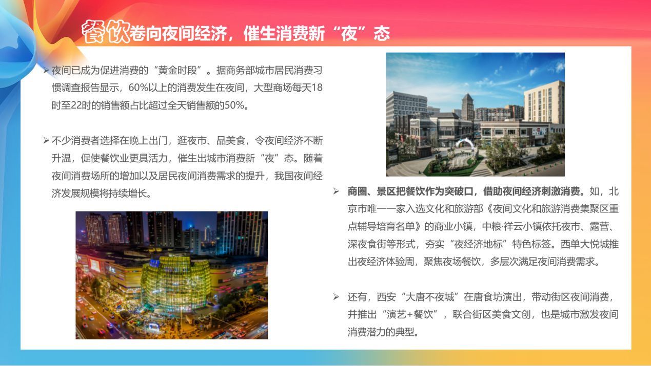 在餐飲消費方面,隨著夜間消費場所的增加以及居民夜間消費需求的提升,我國夜間經(jīng)濟發(fā)展規(guī)模將持續(xù)增長。例如,北京市唯一一家入選文化和旅游部《夜間文化和旅游消費集聚區(qū)重點輔導(dǎo)培育名單》的商業(yè)小鎮(zhèn),中糧·祥云小鎮(zhèn)依托夜市、露營、深夜食街等形式,構(gòu)建了“商圈+生活圈+夜經(jīng)濟”的消費重地,榮獲北京十大商業(yè)品牌、消費季品牌榜“十大文化消費地標”。西安“大唐不夜城”在唐食坊演出,帶動街區(qū)夜間消費,并推出“演藝+餐飲”,聯(lián)合街區(qū)美食文創(chuàng),也是城市激發(fā)夜間消費潛力的典型。《報告》認為,隨著夜間消費場所的增加以及居民夜間消費需求的提升,我國夜間經(jīng)濟發(fā)展規(guī)模將持續(xù)增長。