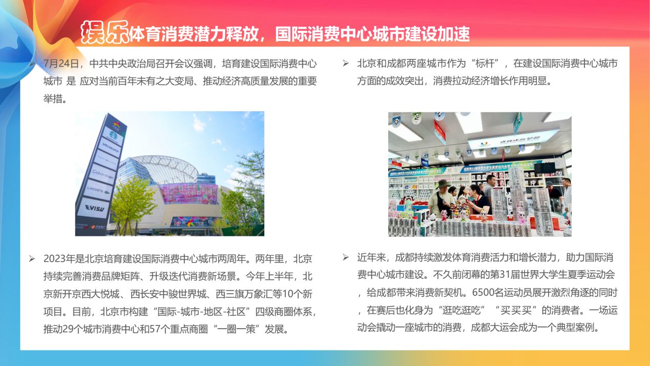 在娛樂體育消費方面,北京、成都兩座城市作為“標桿”,在建設(shè)國際消費中心城市方面的成效突出,消費拉動經(jīng)濟增長作用明顯。以北京為例,2023年是北京培育建設(shè)國際消費中心城市兩周年。兩年里,北京持續(xù)完善消費品牌矩陣、升級迭代消費新場景。今年上半年,北京新開京西大悅城、西長安中駿世界城、西三旗萬象匯等10個新項目。目前,北京市構(gòu)建“國際-城市-地區(qū)-社區(qū)”四級商圈體系,推動29個城市消費中心和57個重點商圈“一圈一策”發(fā)展。