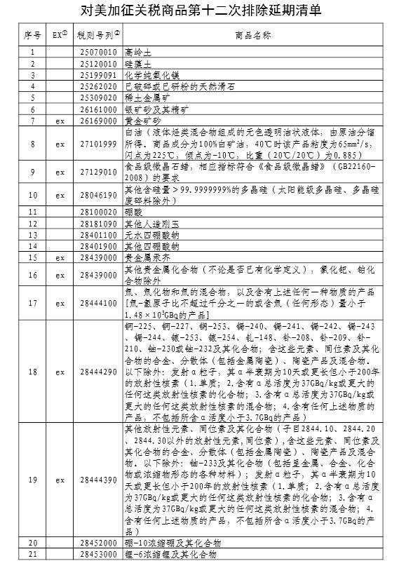 國(guó)務(wù)院關(guān)稅稅則委員會(huì)公布對(duì)美加征關(guān)稅商品第十二次排除延期清單