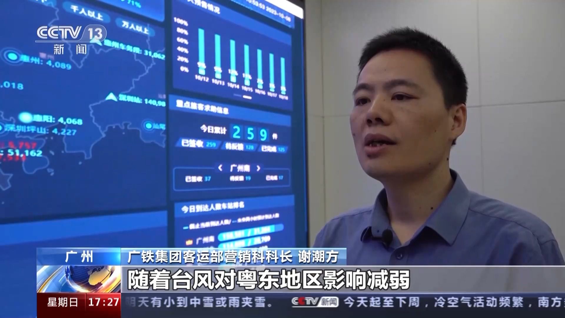 廣鐵集團(tuán)客運(yùn)部營銷科科長謝潮方:隨著臺(tái)風(fēng)對(duì)粵東地區(qū)影響減弱,今天,杭深、廣汕等線路列車運(yùn)行秩序恢復(fù)正常。中秋國慶假期的后幾天,仍是返程客流高峰,我們將加強(qiáng)線路檢查,確保運(yùn)輸安全。