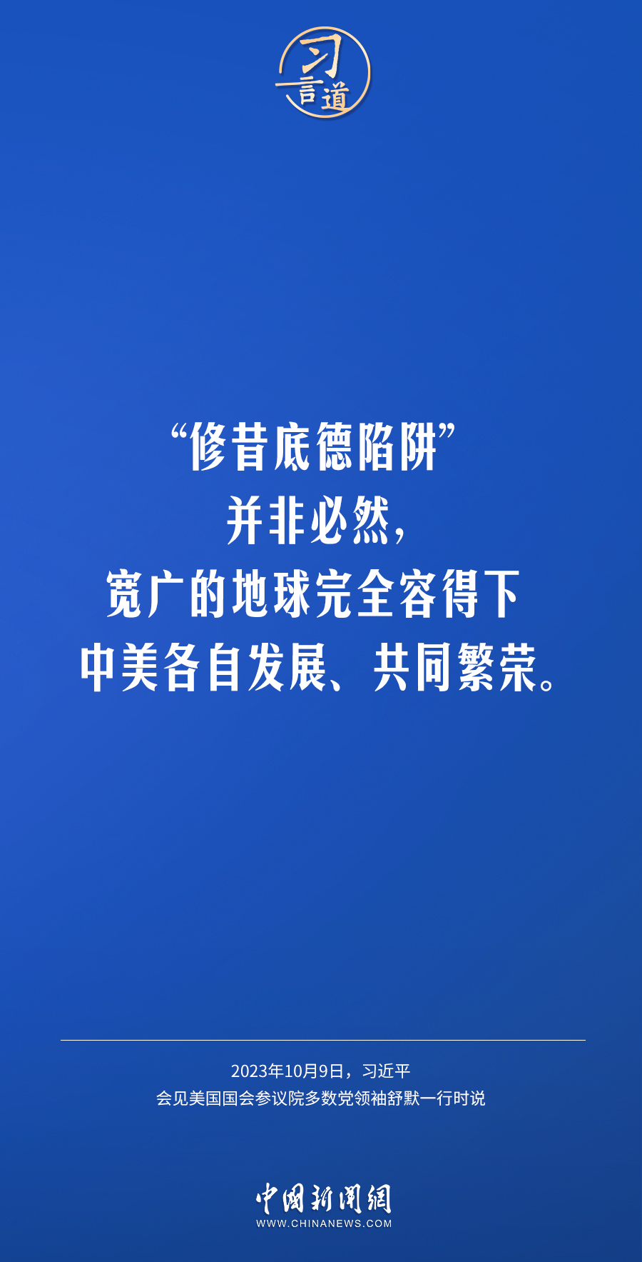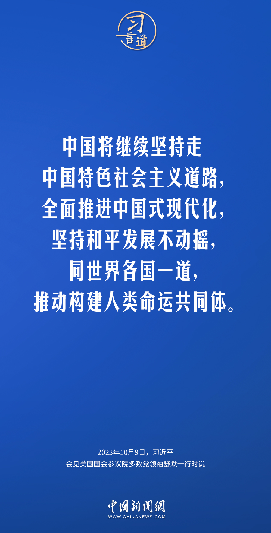 10月9日下午,國家主席習近平在人民大會堂會見美國國會參議院多數(shù)黨領袖舒默率領的美國國會參議院兩黨代表團。習近平指出——