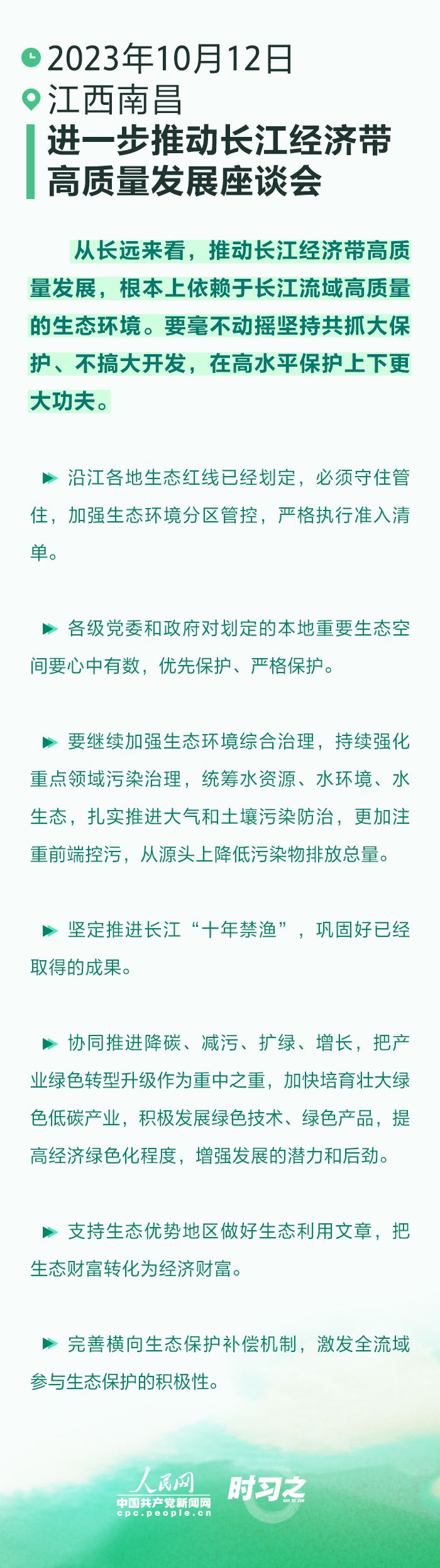 10月12日下午,習近平總書記在江西省南昌市主持召開進一步推動長江經(jīng)濟帶高質(zhì)量發(fā)展座談會并發(fā)表重要講話。座談會上,總書記指出,從長遠來看,推動長江經(jīng)濟帶高質(zhì)量發(fā)展,根本上依賴于長江流域高質(zhì)量的生態(tài)環(huán)境。