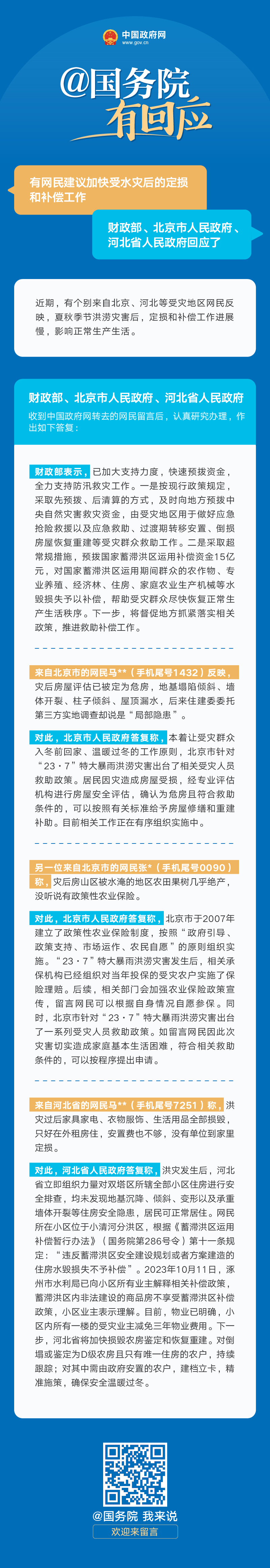 財政部、北京市人民政府、河北省人民政府答網(wǎng)民關(guān)于“建議加快受水災(zāi)后的定損和補償工作”的留言