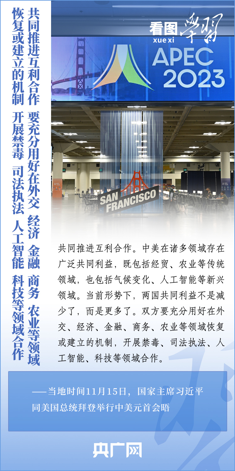 當(dāng)?shù)貢r間11月15日,國家主席習(xí)近平在美國舊金山斐洛里莊園同美國總統(tǒng)拜登舉行中美元首會晤。兩國元首就事關(guān)中美關(guān)系的戰(zhàn)略性、全局性、方向性問題以及事關(guān)世界和平和發(fā)展的重大問題坦誠深入地交換了意見。習(xí)近平主席指出,大國競爭解決不了中美兩國和世界面臨的問題。這個地球容得下中美兩國。中美各自的成功是彼此的機遇。一起來學(xué)習(xí)!