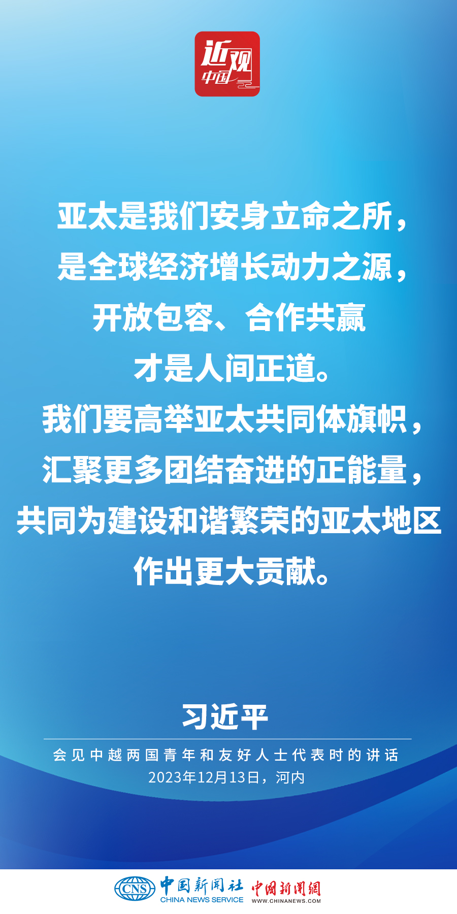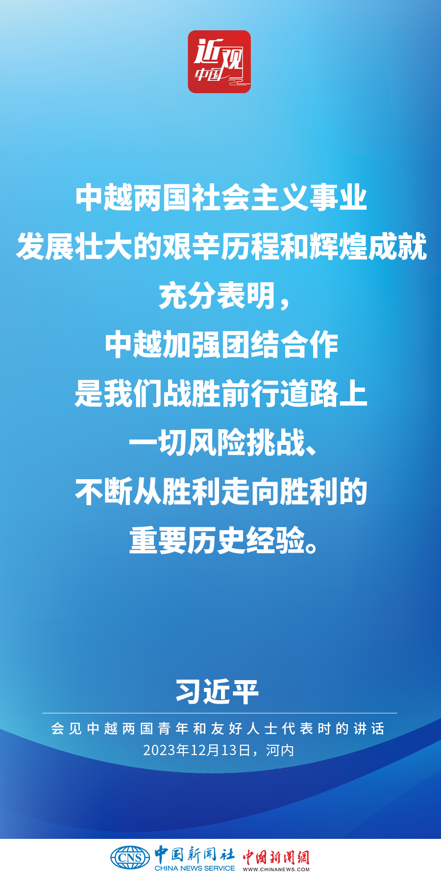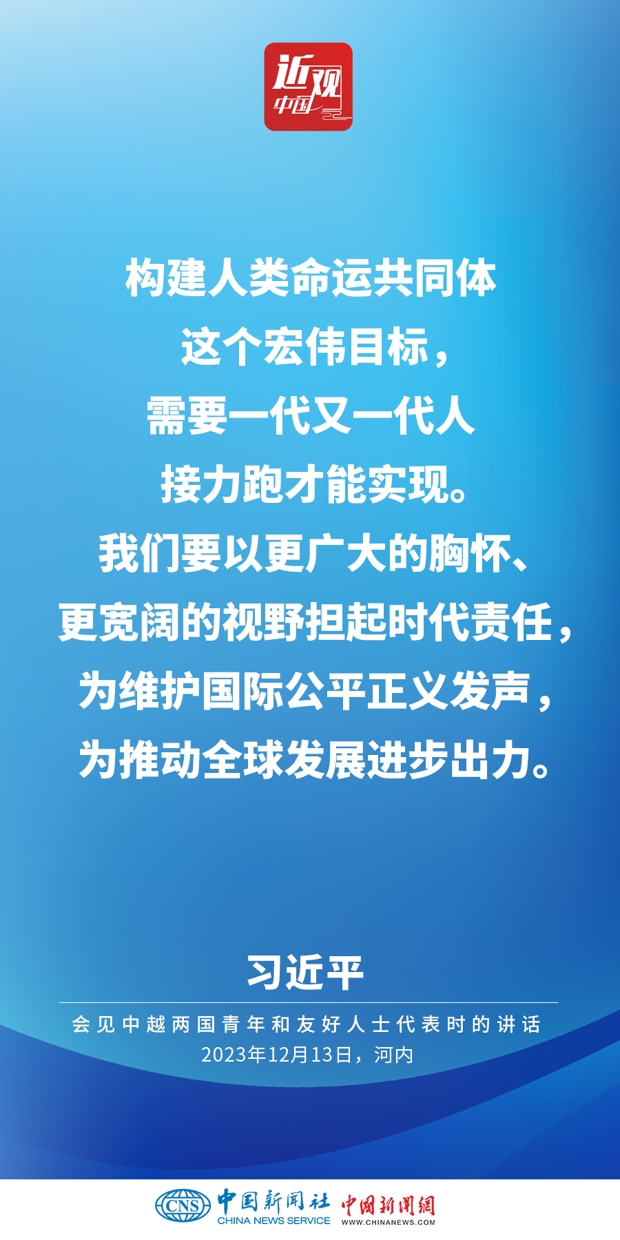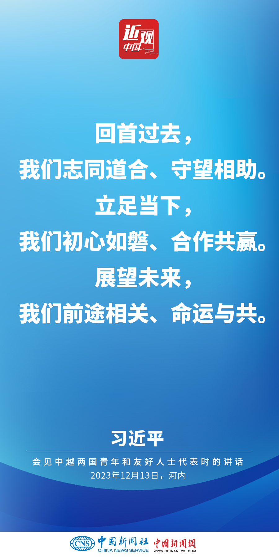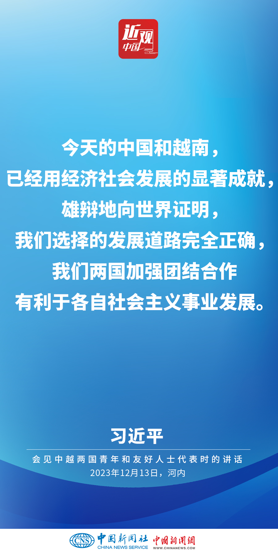 當(dāng)?shù)貢r間12月13日下午,中共中央總書記、國家主席習(xí)近平和夫人彭麗媛在河內(nèi)同越共中央總書記阮富仲夫婦共同會見中越兩國青年和友好人士代表。他在題為《賡續(xù)傳統(tǒng)友誼,開創(chuàng)中越命運共同體建設(shè)新征程》的重要講話中指出,展望未來,我們要始終不忘初心,牢記使命,攜手走好各自社會主義道路,讓工業(yè)化現(xiàn)代化建設(shè)成果更多惠及兩國人民,共同為人類進(jìn)步事業(yè)作出更大貢獻(xiàn)。