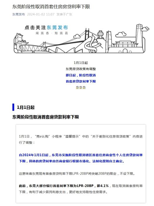 中新網(wǎng)1月2日電 據(jù)“東莞發(fā)布”微信公眾號(hào)消息,自2024年1月1日起,廣東省東莞市實(shí)施階段性取消轄區(qū)首套住房商業(yè)性個(gè)人住房貸款利率下限,具體的房貸利率由各商業(yè)銀行根據(jù)市場(chǎng)化、法制化原則自主確定。這意味著東莞現(xiàn)有首套房貸利率下限LPR-20BP將突破20BP的限定,不設(shè)下限。