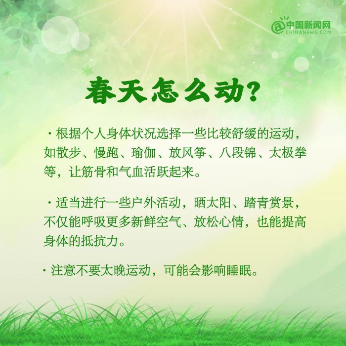 春天是萬物復(fù)蘇的季節(jié),也是調(diào)養(yǎng)身體的好時節(jié)。①每天保證6~8小時的睡眠,避免熬夜;②適當(dāng)進(jìn)行一些戶外活動,曬太陽、踏青賞景等;③不過早減衣,穿衣注意下厚上?。虎茏⒁馇宓嬍?,多吃蔬菜,多喝水……春季養(yǎng)生要注意什么?詳戳↓↓