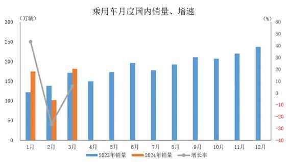 2024年3月,乘用車國(guó)內(nèi)銷量181.2萬(wàn)輛,環(huán)比增長(zhǎng)78.1%,同比增長(zhǎng)5.8%。