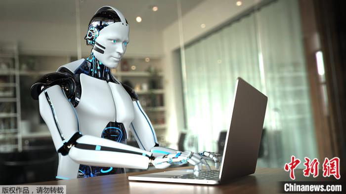資料圖:人形機器人在電腦上打字的示意圖。
