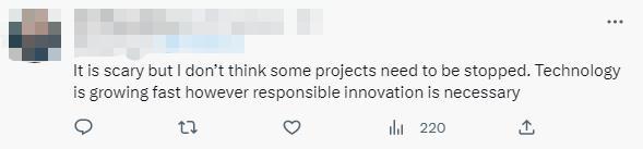 還有人分析,“這很可怕,但我認為有些項目不需要停止。技術正在發(fā)展迅速,負責任的創(chuàng)新也是必要的?!?/p>