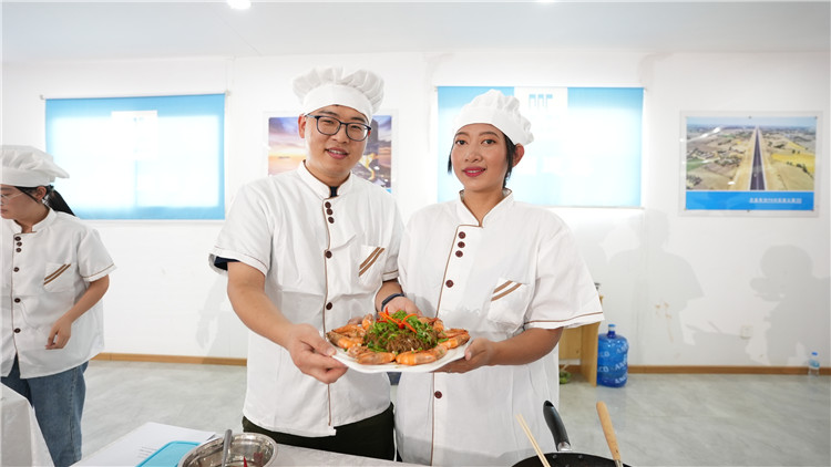 4月6日,柬埔寨新金邊國際機場項目建設(shè)現(xiàn)場,劉曉仙(左)和曼玉良在中國建筑(柬埔寨)職工廚王爭霸賽上展示“中建(柬)一家親”炒米粉。中國建筑供圖