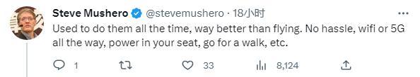 曾在中國工作多年的企業(yè)家Steve Mushero也留言說,“我以前一直坐高鐵,比坐飛機(jī)好多了。不麻煩,一直有wifi或5G,你的座位上有電源,還可以散散步等。”