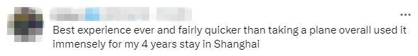 有網(wǎng)友介紹說,“最好的體驗(yàn),比坐飛機(jī)要快得多,我在上海呆了4年,坐過很多次?!?/p>